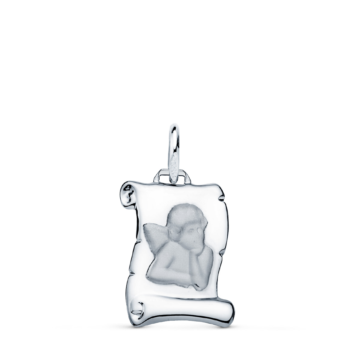 9K COLGANTE PERGAMINO ORO BLANCO ANGEL BURLON BRILLO 14X11 MM