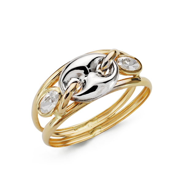 9K SORTIJA ORO BICOLOR DOBLE CUERPO CON CALABROTE Y CIRCONITAS, ANCHO: 7 MM