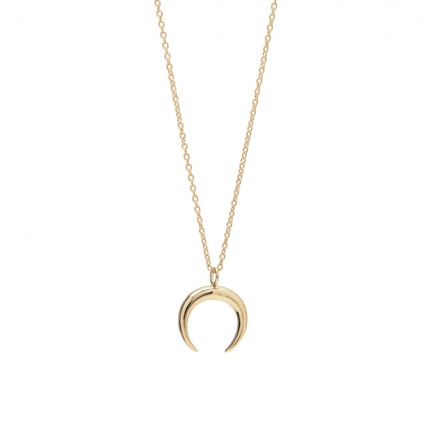 Collar media luna fabricado en plata de ley 925mm chapada oro. El detalle de la lune disponde de una anchura de 15mm y una altura de 14mm. La cadena tiene una medida de 40cm que se puede ampliar hasta los 45cm.