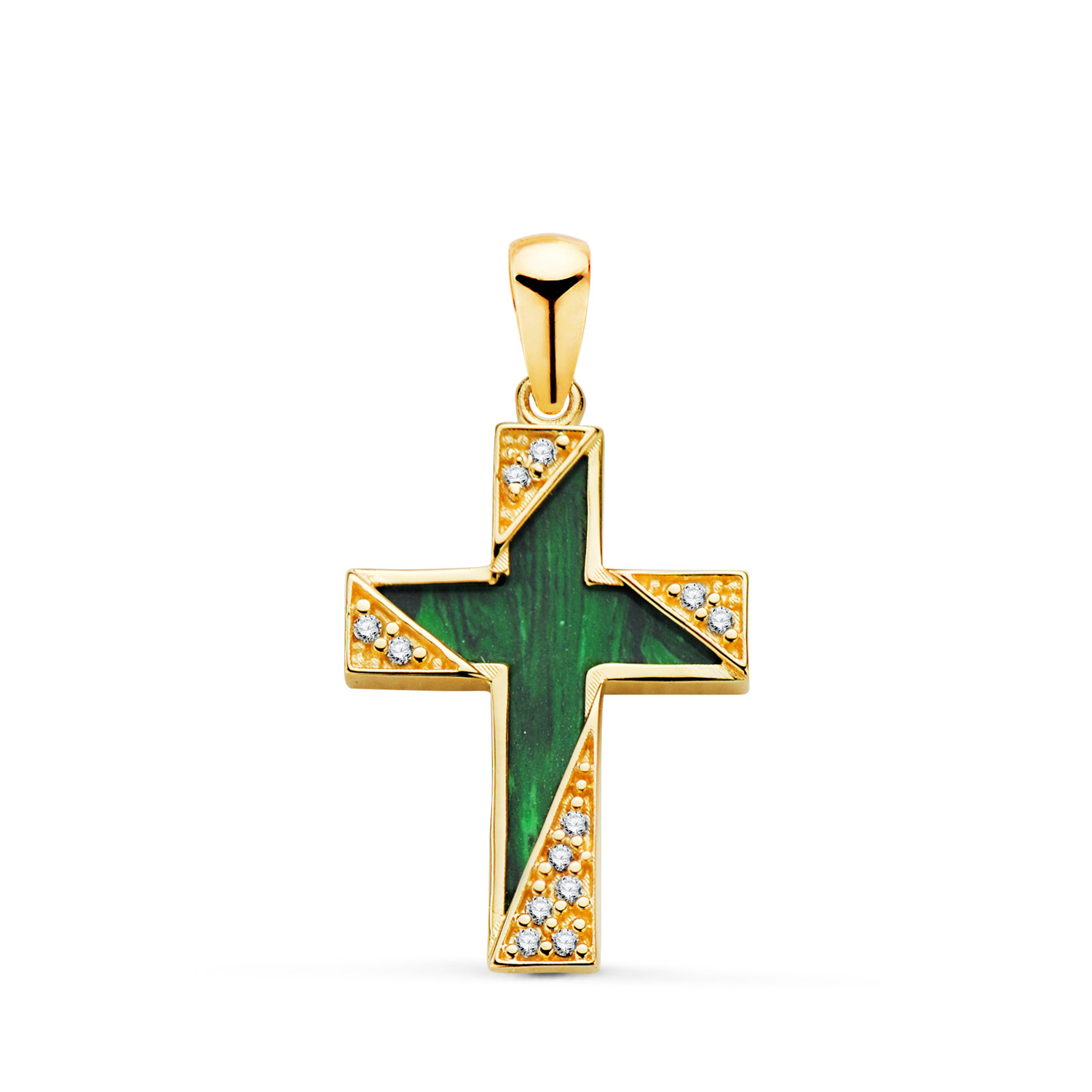 18K CRUZ ORO AMARILLO MALAQUITA DETALLES CON CIRCONITAS, MEDIDA: 19 X 12,5 MM