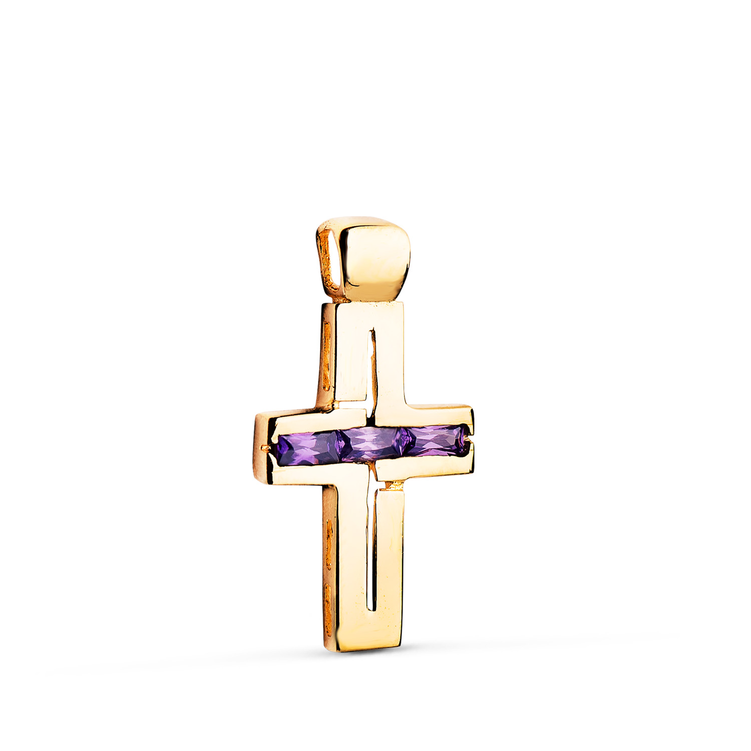 18K CRUZ ORO AMARILLO PIEDRAS BAGUETTE CIRCONITAS COLOR AMATISTA, 25 X 13 MM