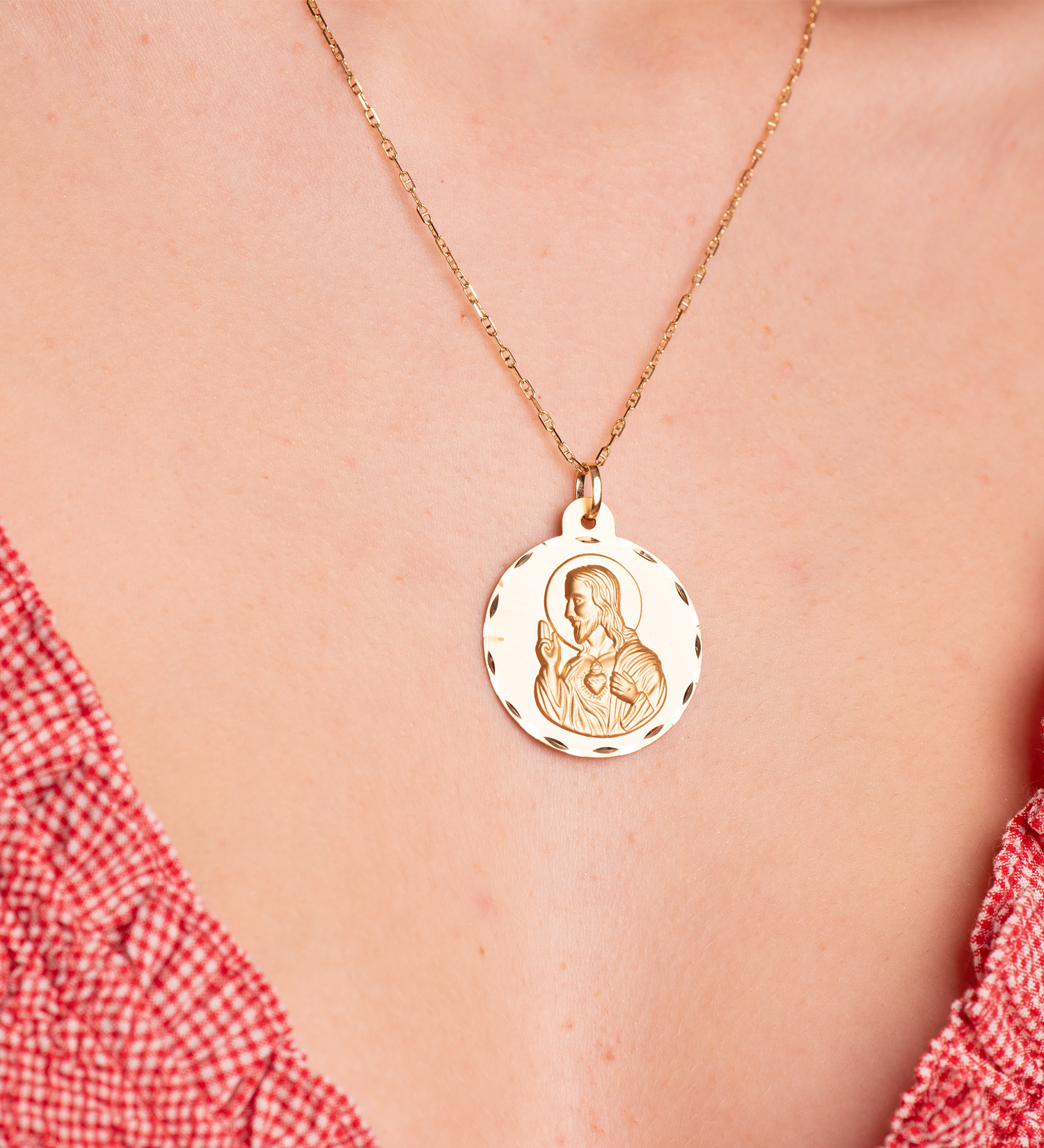 18K ESCAPULARIO ORO AMARILLO TALLADO VIRGEN DEL CARMEN CORAZON DE JESUS 30 MM