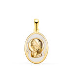 18K MEDALLA ORO AMARILLO OVAL CON NACAR BLANCO Y VIRGEN NIÑA 17 X 12 MM