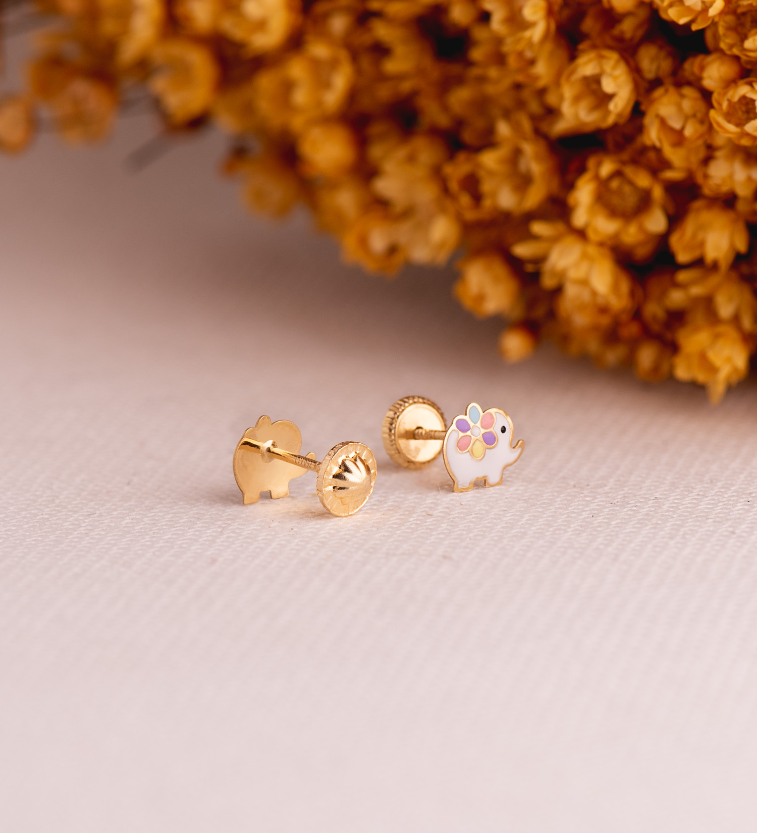 18K PENDIENTES ORO AMARILLO ELEFANTES ESMALTADOS. MEDIDA: 7 X 6 MM. CIERRE TUERCA