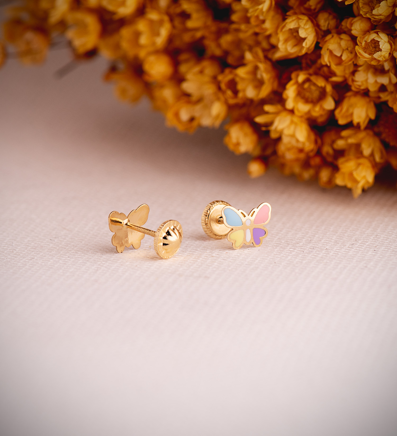 18K PENDIENTES ORO AMARILLO MARIPOSAS ESMALTADAS. MEDIDA: 7 X 6 MM. CIERRE TUERCA