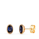 18K PENDIENTES ORO AMARILLO OVAL PIEDRA AZUL BORDES BOLITAS. MEDIDA: 6 X 4MM. CIERRE PRESION