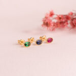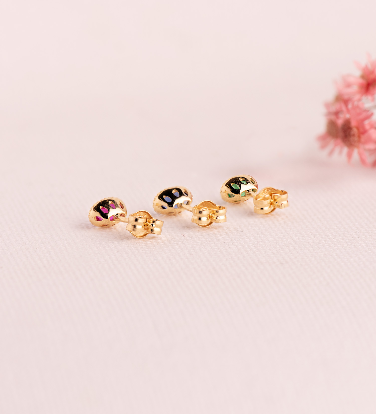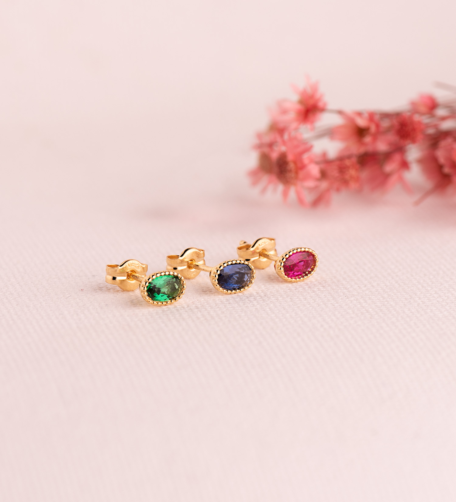18K PENDIENTES ORO AMARILLO OVAL PIEDRA VERDE BORDES BOLITAS. MEDIDA: 6 X 4MM. CIERRE PRESION