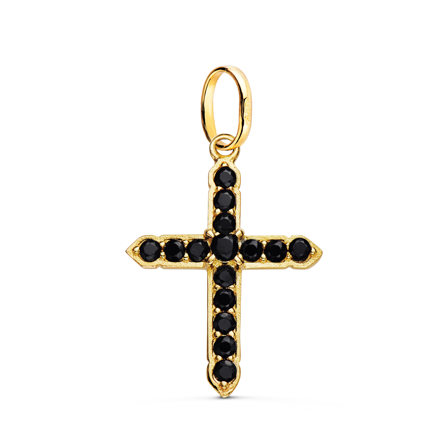 18K CRUZ ORO AMARILLO CON 15 CIRCONITA NEGRAS EN GARRAS, 24 X 18 MM