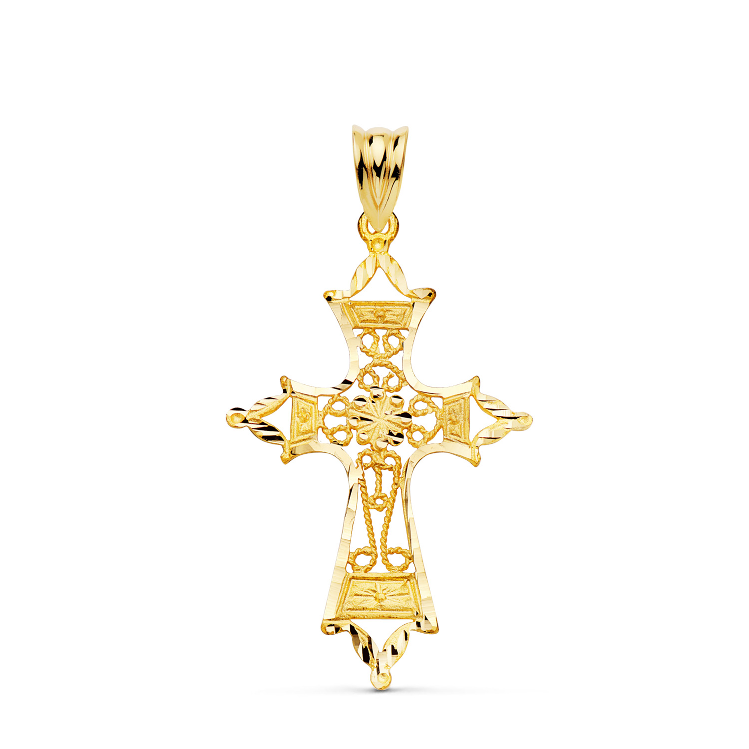 18K CRUZ ORO AMARILLO FILIGRANA BORDES TALLADOS, 37X25 MM