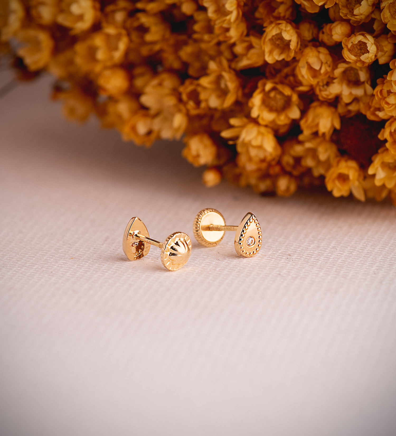 18K PENDIENTES ORO AMARILLO GOTA CON CIRCONITAS Y BORDES BOLITAS. MEDIDA: 6 X 4 MM. CIERRE TUERCA