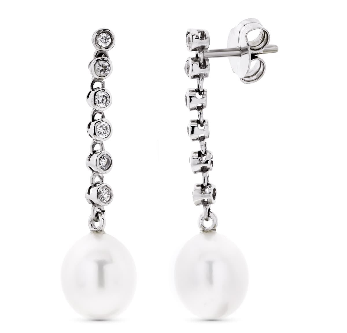 18K PENDIENTES ORO BLANCO LARGOS CON CIRCONITA Y PERLA CIERRE PRESION
