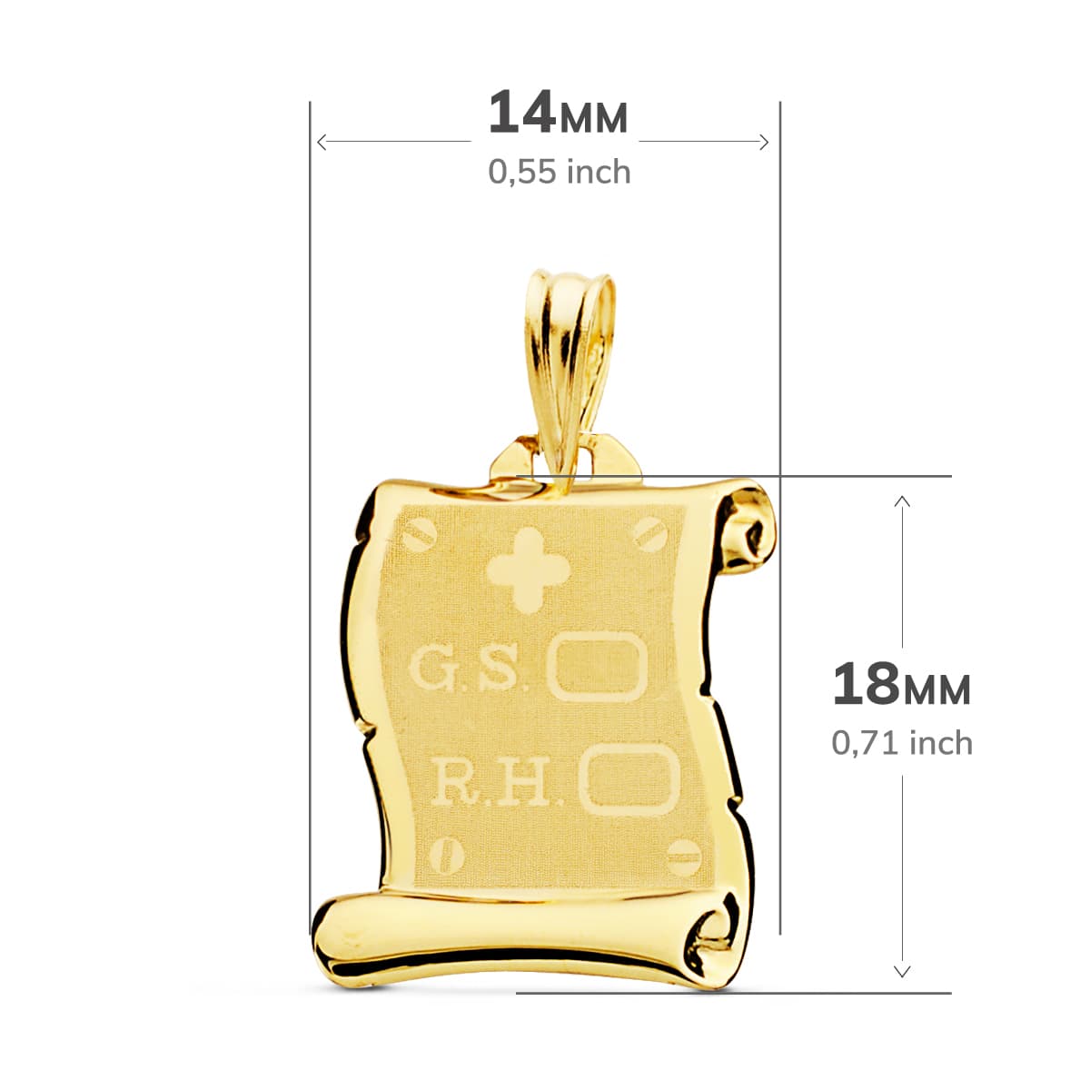 18K PLACA CHAPA COLGANTE PERGAMINO ORO AMARILLO BRILLO GRUPO SANGUINEO RH MATE 18X14 MM
