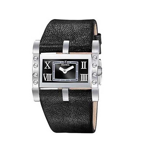 Reloj de mujer Festina con caja de acero inoxidable, circonitas en el bisel, y correa de piel negra.
