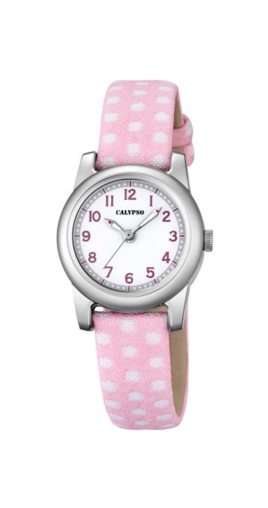 Reloj Calypso para niña K5712/2 fabricado en caja de acero, movimiento en cuarzo y correa de tela rosa con cierre de hebilla. Reloj resistente al agua 5Atm. El diametro de la caja es de 26mm aproximadamente y la correa tiene un ancho de 12mm. Kuara Joyeros es distribuidor oficial de los productos del Grupo Lotus. El reloj se envía en su estuche original con su garantia de dos años y envuelto en regalo totalmente gratuito.
