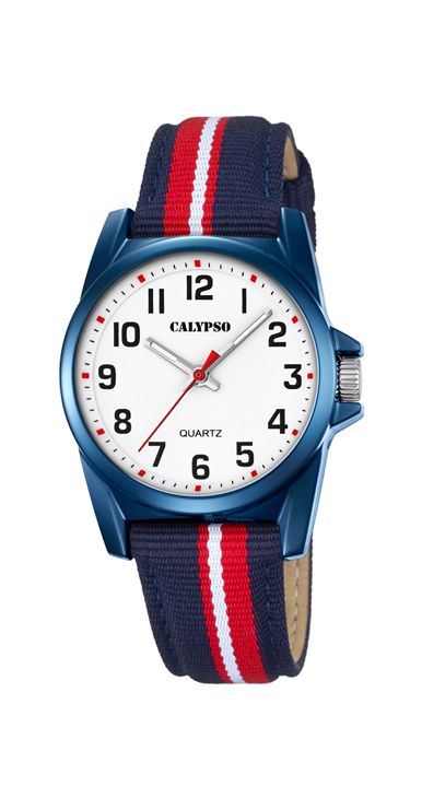 Reloj Calypso para niño K5707/5 fabricado en caja de acero ionizado azul, movimiento en cuarzo y correa de tela con cierre de hebilla.Resistente al agua Wr. 5Atm. El diametro de la caja es de 35mm aproximadamente y la correa tiene un ancho de 17mm. Kuara Joyeros es distribuidor oficial de los productos del Grupo Lotus. El reloj se envía en su estuche original con su garantia de dos años y envuelto en regalo totalmente gratuito.