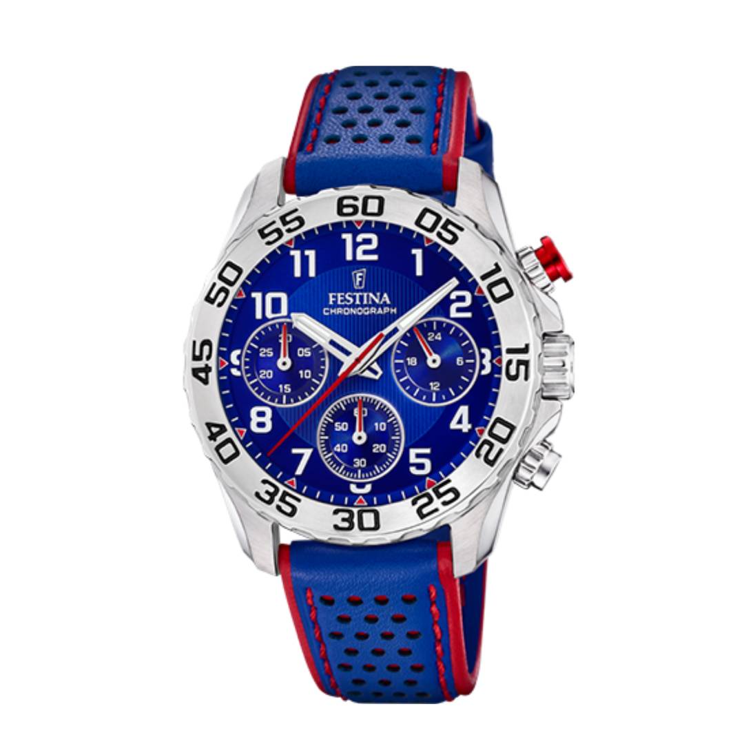 El Festina Junior Collection F20458/2 es un reloj analógico diseñado específicamente para niños, muy popular como regalo de Primera Comunión por su equilibrio entre un estilo deportivo y elegante. Destaca por su esfera azul vibrante y una correa de piel a juego con detalles en rojo.