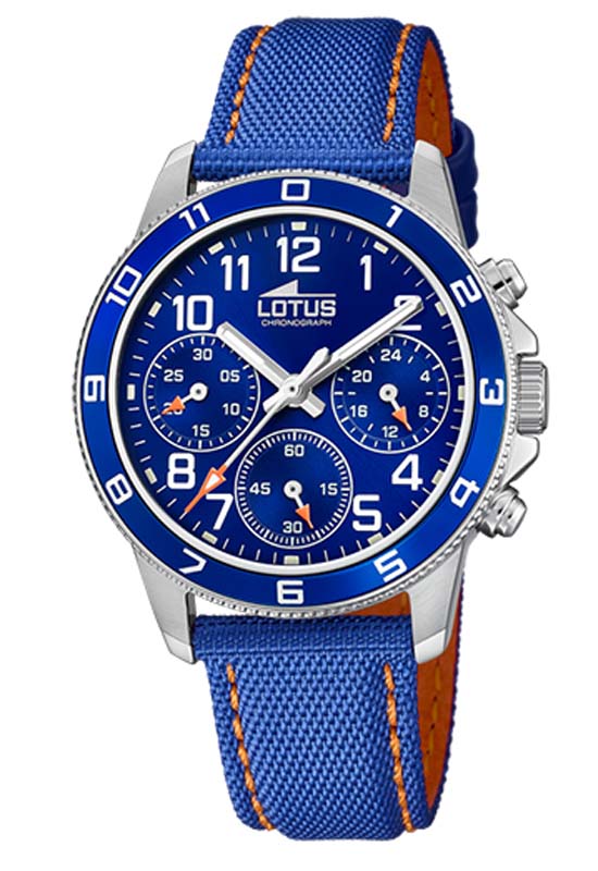 El reloj Lotus 18581/2 es ideal para regalar en comunión. Fabricado en caja de acero inoxidable. Fondo de esfera en azul y correa de tela azul con perpuntes naranjas.