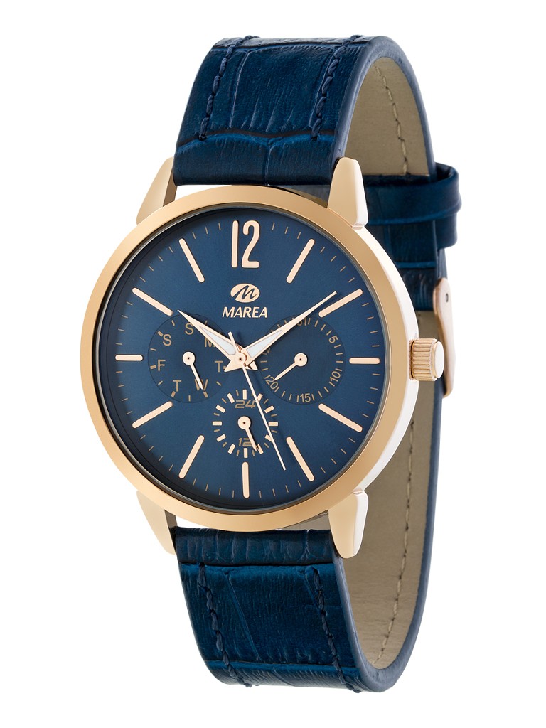 Reloj marea de caballero tipo vintage multifunción con caja chapada ip rosado y esfera azul. La caja mide 41mm aprox y la altura de la misma es de 10mm. La correa es de polipiel azul de 20mm de ancha. Se envía estuchado y con su correspondiente garantia original.