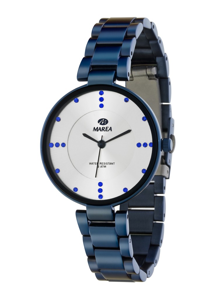 Modelo de reloj de mujer analogico. Su mecanismo es de cuarzo con pila. Su caja es de metal antialégico con IP azul. Sumergible 30 metros y cuenta con un diametro de caja de 36.00mm aprox.