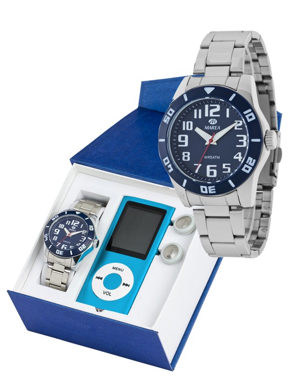 Reloj Marea para niño con armys metalico. Caja de acero plateada y esfera azul. La maquinaria es de cuarzol. Resistente al agua 5Atm. El diametro de la esfera es de 35mm aproximadamente. Se envía en estuche original y garantia de dos años. Regalo dentro del estuche de un MP4.