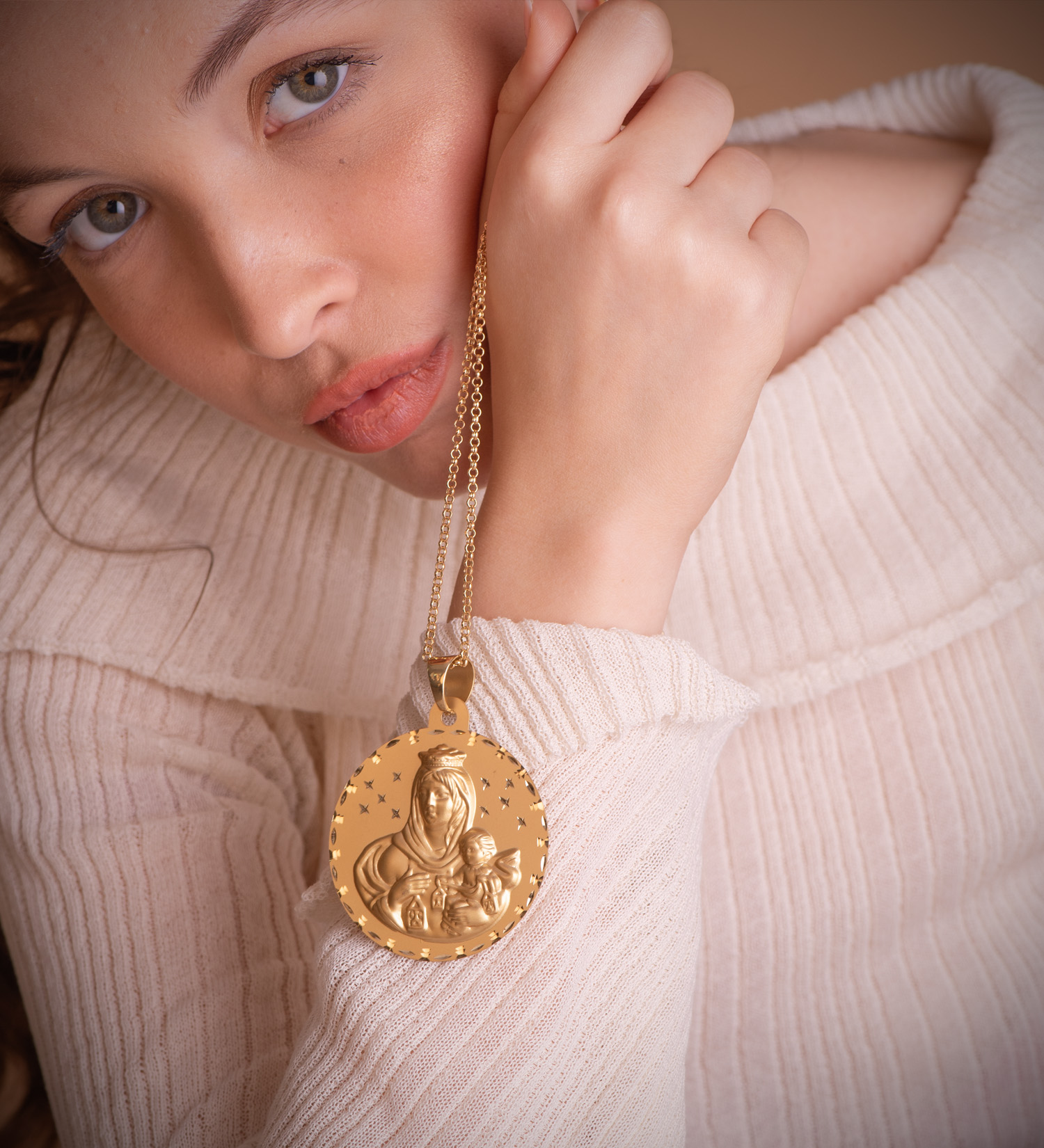 18K MEDALLA ORO AMARILLO VIRGEN DEL CARMEN TALLADA 42 MM